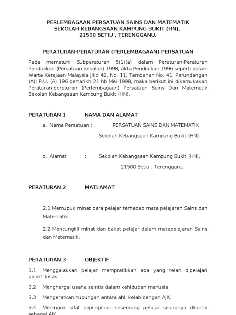 Akta Pendidikan dan Warta Kerajaan 9 5. Sejarah penubuhan persatuan sains dan matematik mula ditubuhkan pada10 mac 1985 dengan bilangan ahlinya seramai 65 orang iaitu 30 orang lelaki dan 35 orang perempuan. Berdasarkan hakikat kejadian insan setiap murid mempunyai bakat dan potensi untuk memimpin sekurang-kurangnya untuk memimpin diri sendiri menjadi apa yang diinginkan.